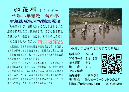 「名酒の会」が田植えからこだわり造り上げた越前の食文化に合う伝統酒です。